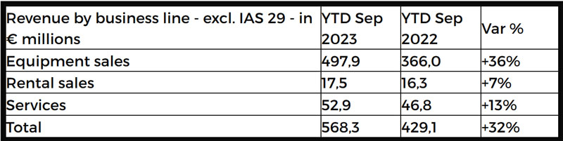 At the end of September 2023, equipment sales were up +38%, rental business +9% and services +15%.